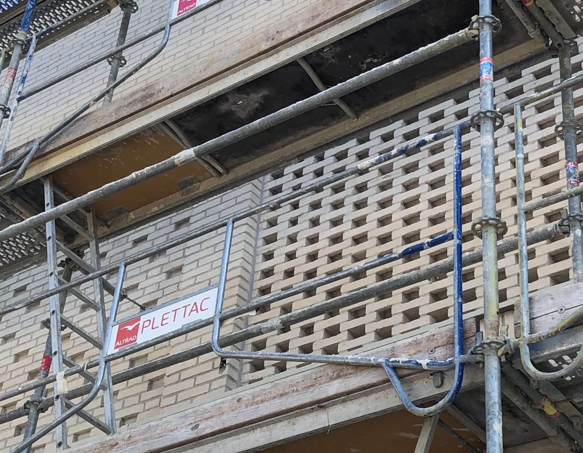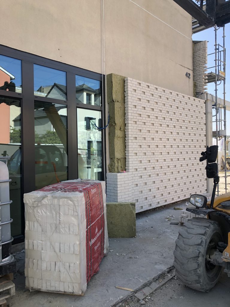 La façade de la future Mairie d’Arcueil, de délicats motifs de brique qui vont bientôt remplacer en totalité l’enduit gris beige d’origine, un ravalement radical pour une image transformée !