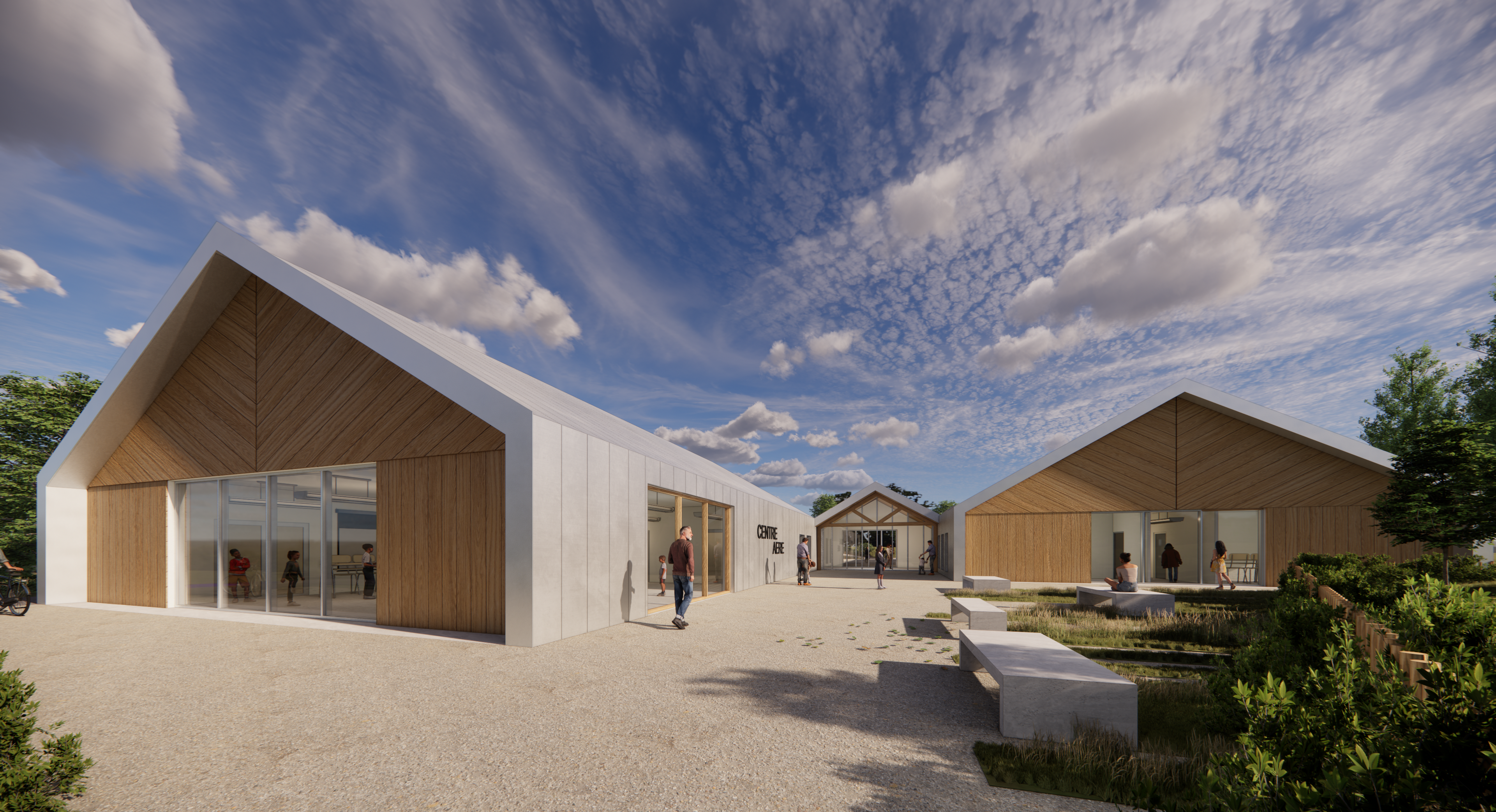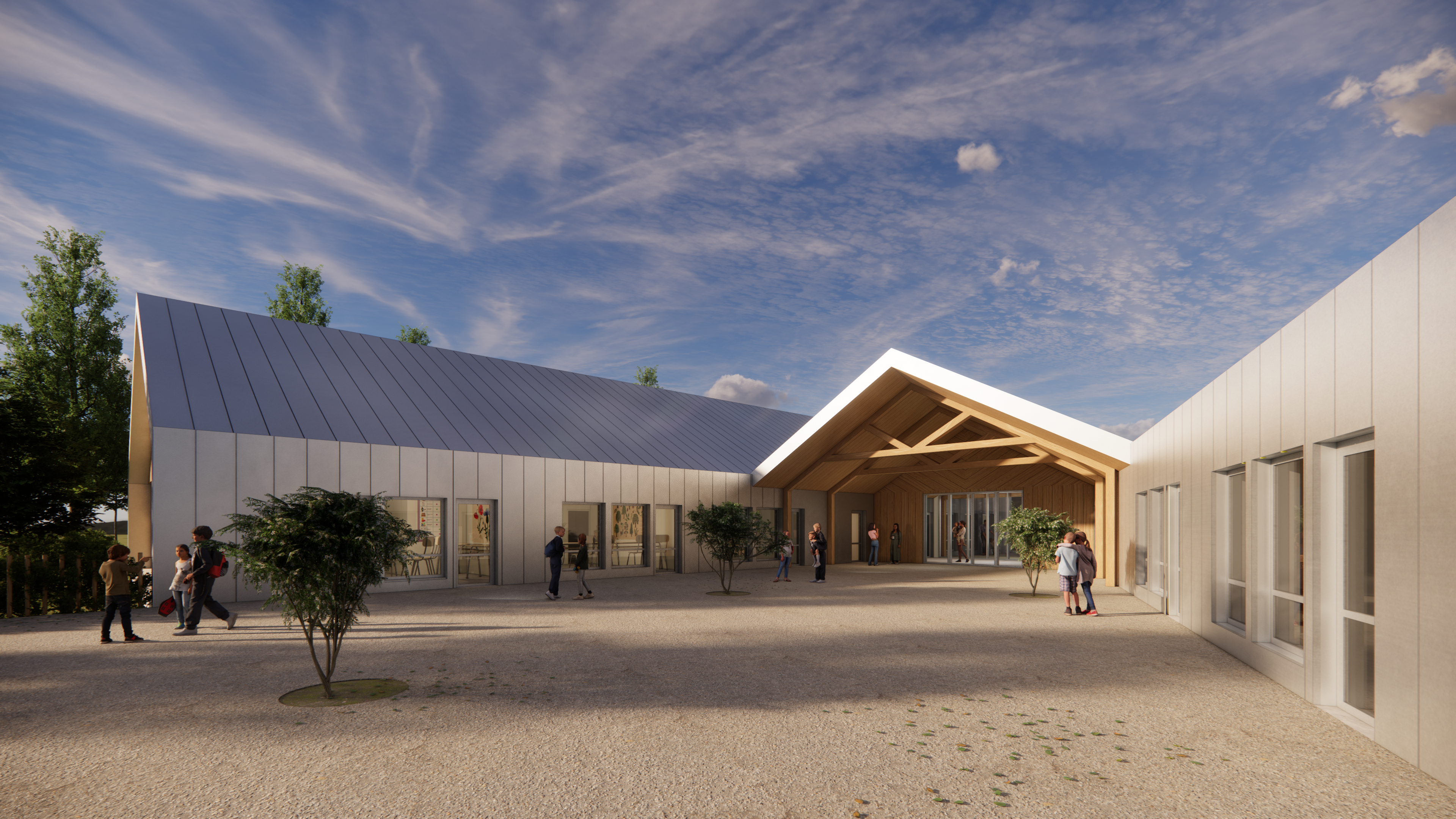 L’opération a pour objet la démolition de l’ancien accueil de loisirs et la reconstruction sur le même site, d’un bâtiment en construction industrialisée au coeur d’un vaste terrain arboré dédié à l’enfance. Le bâtiment reprend les codes des grandes fermes traditionnelles à proximité. Toits inclinés avec des pentes de 40 %, continuité de la façade et du toit avec un bardage en zinc à joint debout, l’ensemble se décline dans un langage contemporain épuré et sobre.