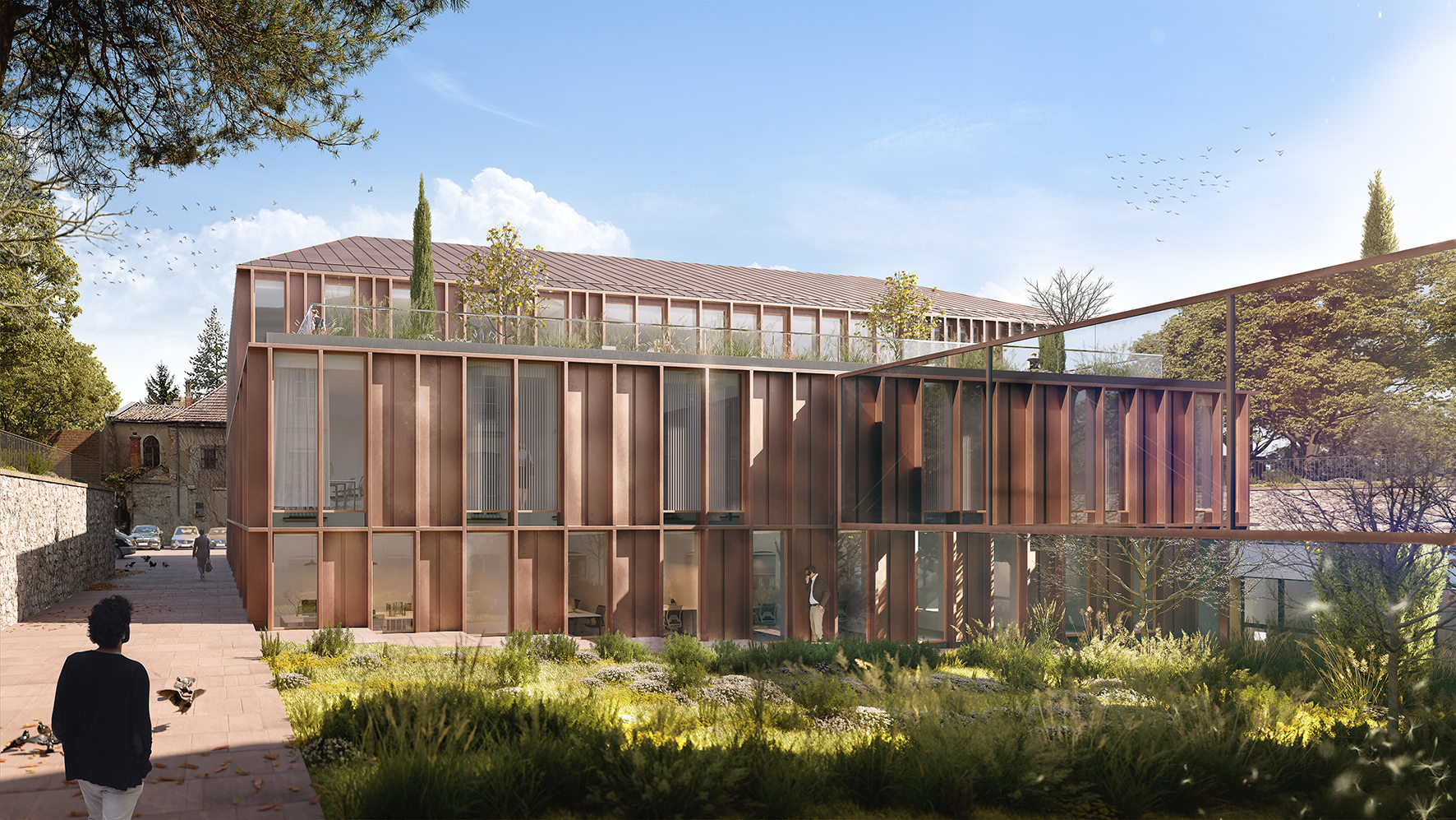 Au cœur de la cité historique de Mâcon, le projet reprend les codes de la construction traditionnelle bourguignonne. Bâtiment en longueur, surmonté d’un toit à double pente avec croupe, l’ensemble est traité de façon contemporaine avec un zinc pré patiné rouille, qui habille l’ensemble des façades et la couverture. L’extension est reliée au bâtiment principal par une passerelle entièrement vitrée, aérienne et qui relie les deux entités. Au cœur de l’ilot, un jardin préserve l’intimité du lieu, la quiétude des justiciables et celle des magistrats. L’ensemble est conçu en structure métallique, avec façades ossature bois (FOB), pour un chantier sec et rapide dans ce site très contraint, au cœur du centre historique de Mâcon.