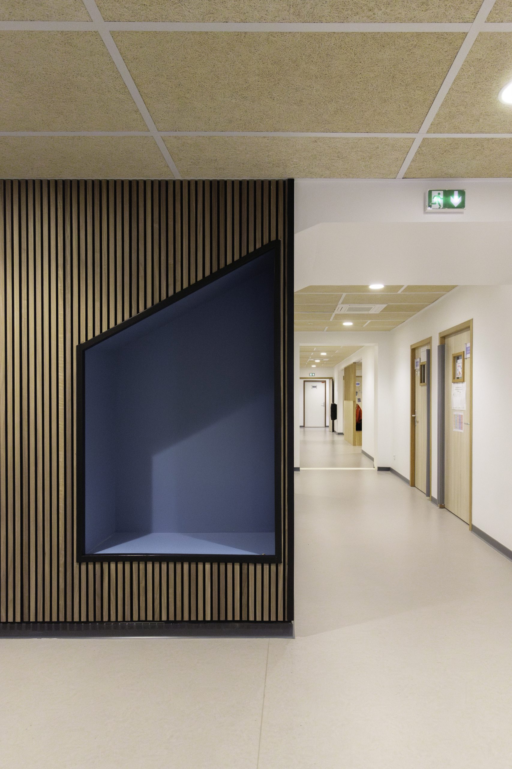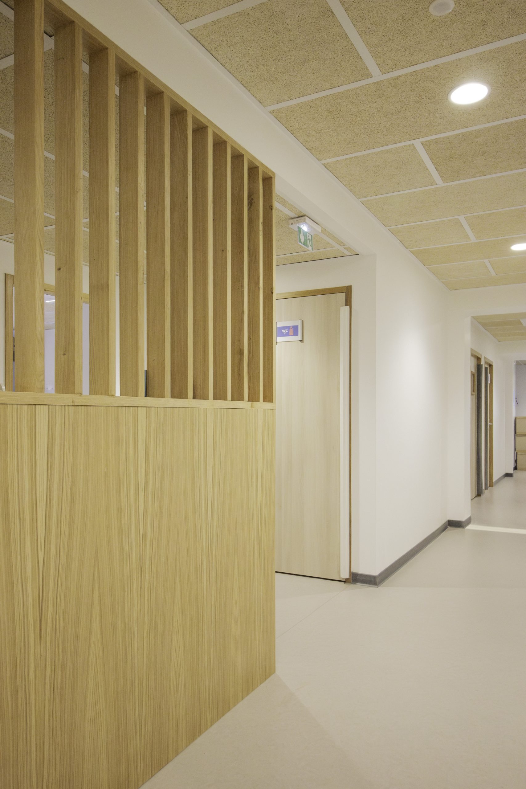 A l‘intérieur les espaces ont été spécialement conçus pour les enfants, avec des salles d’activités, un espace SNOEZEN, l’ensemble agrémenté de bois en claustra pour différencier les zones des petits et grands.