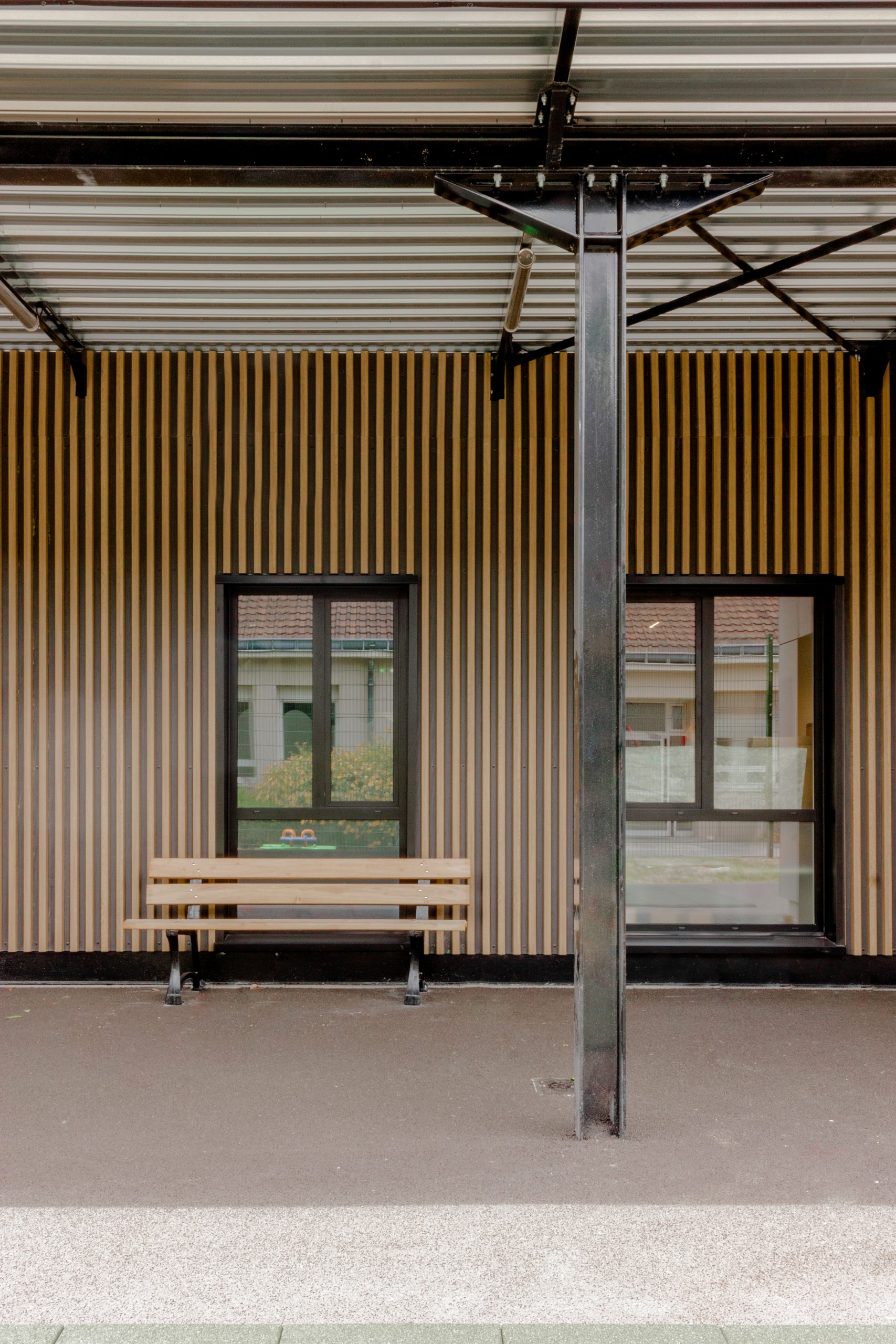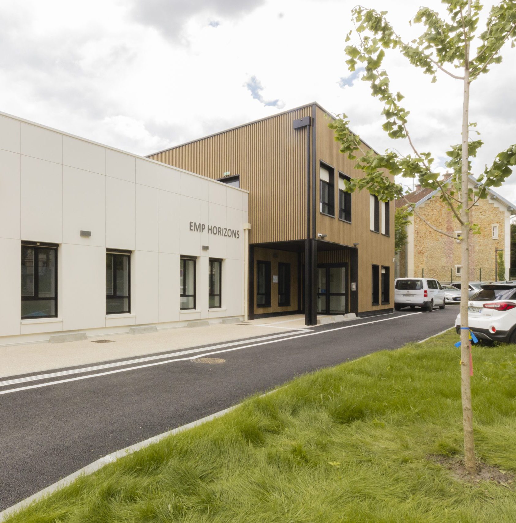 Au coeur du parc de l’hôpital de Saint Cyr l’Ecole, l’ensemble vient occuper une parcelle arborée, longeant la rue Lenôtre. Le bâtiment a 2 façades, l’une sur l’entrée soulignée par un porche surmonté du R+1 en bardage imitation bois, l’autre sur la cour des enfants, en bardage de panneaux de TRESPA blanc cassé.
